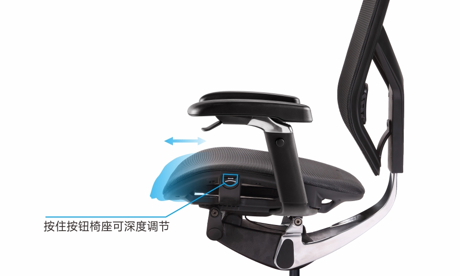 椅座深度调节:按住按钮或者上拉拨片,并滑动椅座,用户可根据自己的使用习惯和舒适度进行座深调节;椅座高度调节:椅座高度根据使用者身高进行调节,以满足使用者膝盖弯曲90度的理想效果。