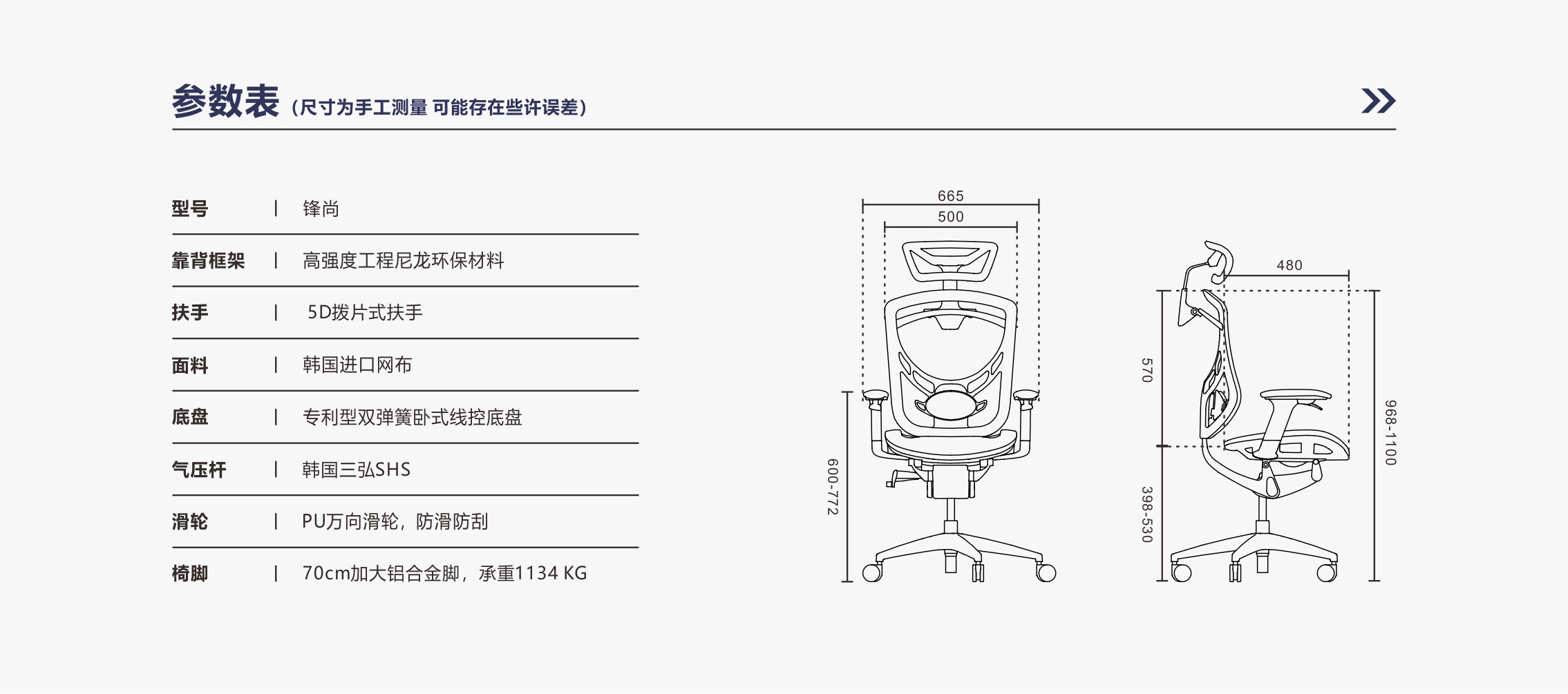 头枕高度调节:5档5cm升降调节;头枕角度调节:头枕36度前后旋转调节;头枕面旋转调节:头枕面4档45°旋转调节
